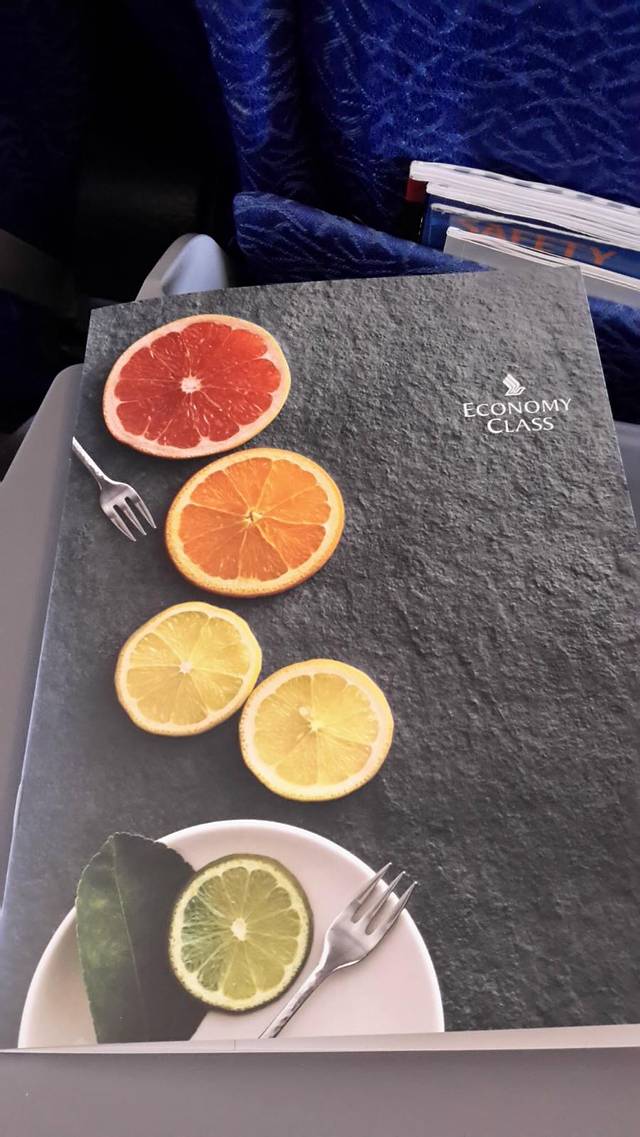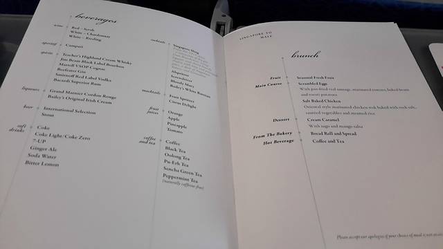 话说新加坡航空在世界享誉盛名,果然不一样,从飞机的舒适度,到飞机的平稳,机上的餐食还有服务绝对都是一流的,如果说一定要找个毛病,那就是太冷了,真不是一般的冷,坐夜班的飞机,新航除了餐饮,抱枕,毛毯,还会提供一个洗漱包,里边有到小腿的袜子,可以在夜间休息的时候把鞋子脱了,穿着它更好的休息,即保暖又干净,包里还有一套牙膏牙刷,第二天下飞机的时候可以刷牙,是不是很人性化的服务啊,随便上一张新加坡的菜单吧