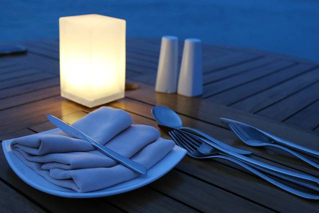 天色渐晚,也该去吃饭了,走到水屋旁的餐厅选的室外的位置,非常的漂亮,看着星空吃着美食,最重要的是跟爱的人在一起享受我们的时光。
