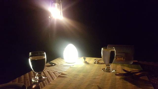 回去后等就是海边烛光晚餐,天已经全黑,没有烛光真能吃鼻子里,但是非常安静,在沙滩上支起一张桌子,放上一盏油灯,耳边听着海浪声,抬头满天繁星。静谧的只有彼此,吃着8道菜的西餐,品尝着法国波尔多的红酒,专职管家的全程服务,彼此之间传递的情话,把此刻的美妙定格在脑海里。