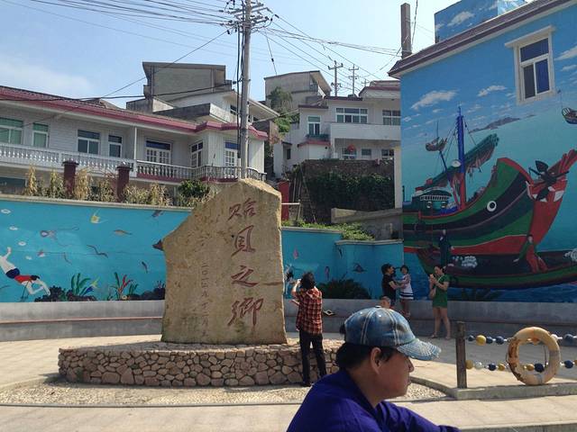 到了沈家湾码头,有个停车场,我们就把车停在那里了,事后发现失误了,因为岛上到景点的车子很少,包车费用太贵了。然后买了到泗礁(嵊泗本岛)的船票,船次多,不用担心买不到票,如果想将车开到岛上,需要早点到码头买票。到了泗礁码头,有到镇上的巴士,直接说到菜园镇客运站就好,然后买到东海渔村的车票,就可以了。交通还是很方便的,下了车跟老板打电话,会派人来接的。我们住的这家旅店离沙滩一公里左右,走路几分钟就到了,又不会像海边那么吵,睡眠浅的人可以选择这里。房间有阳台,可以晒衣服,不过海岛上风比较大,很容易就把衣架吹倒。办好入住,我们到附近逛了逛,每个墙上都画满了图画,别有一番滋味。海边浪比较大,小孩子们一点都不怕,大着胆子往里面冲。