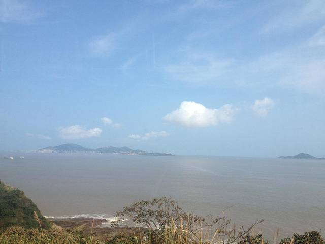 下了码头,坐公交去东海渔村的路上看到的海,水有些混,天很蓝