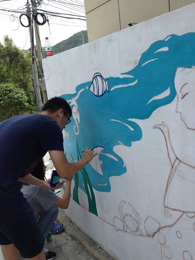 每天都有学生模样的人在墙上作画,海岛上的房子充满了童趣。