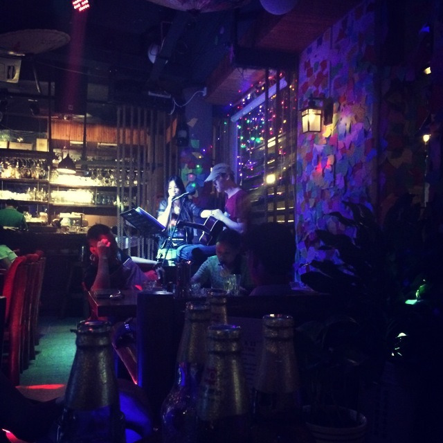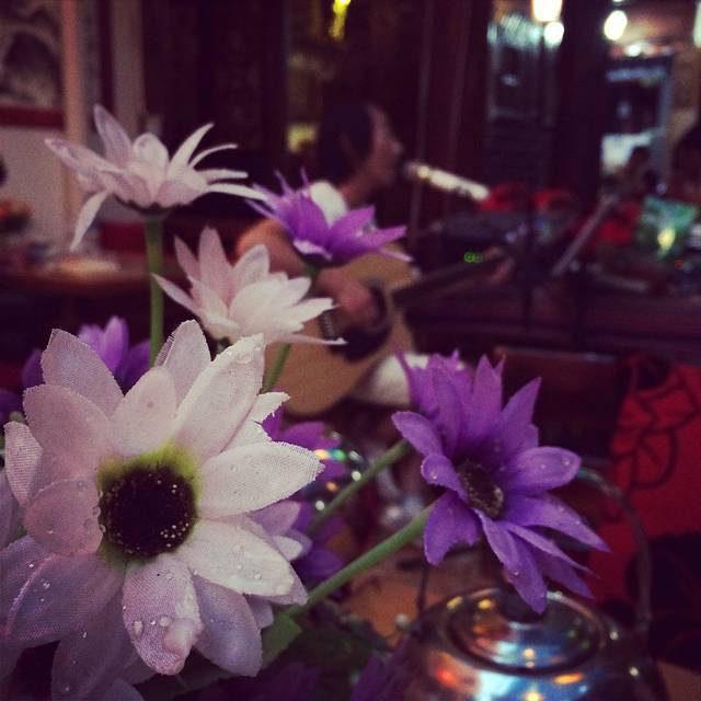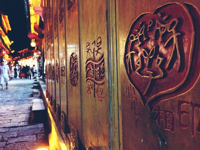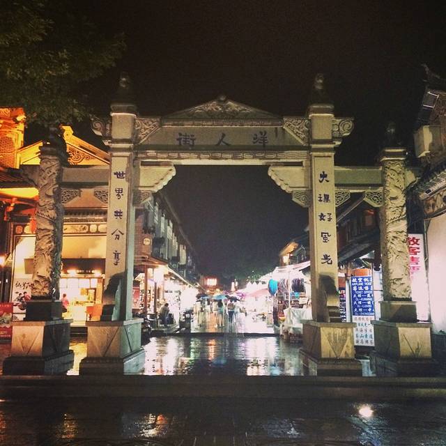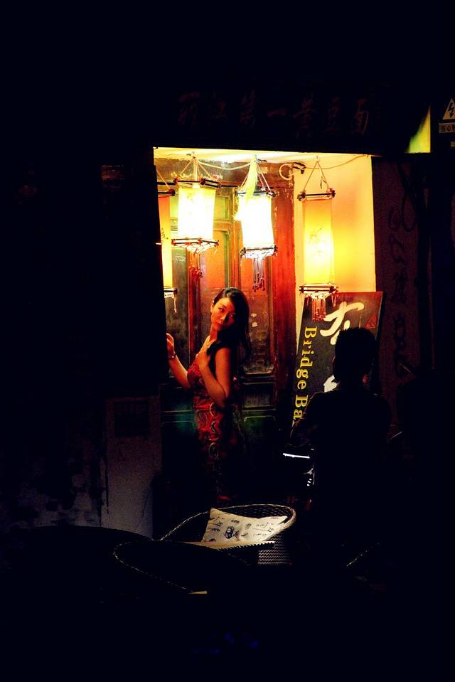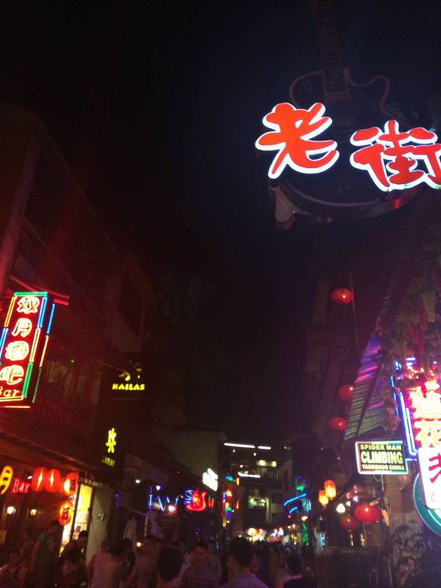 王姐匆匆赶火车去昆明。小伙伴送她到外面打的。我脚太痛了就坐在一边等她回来。这里是比较安静的兴文巷。驻唱歌声也很动人 不输酒吧一条街