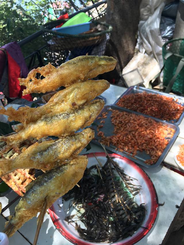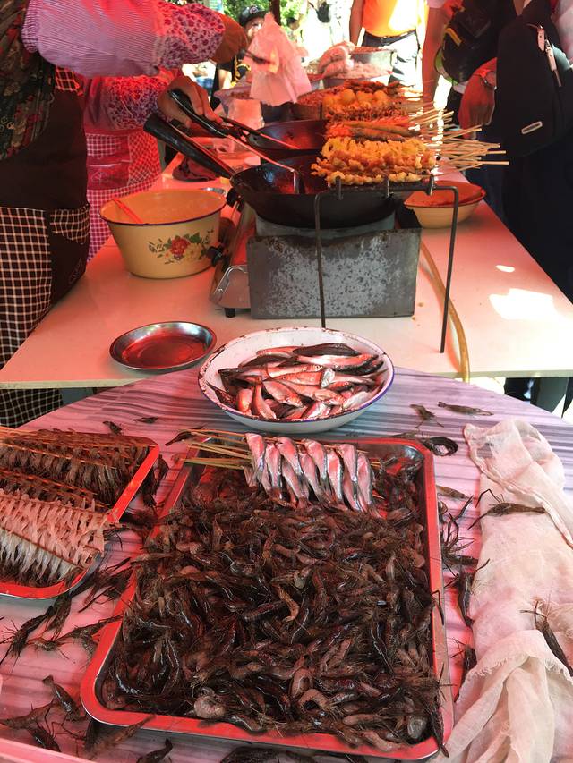 这是在风情岛上的小吃,一串串的鱼儿和小虾都是活的,裹上一层面粉炸着吃,别提有多鲜美了!