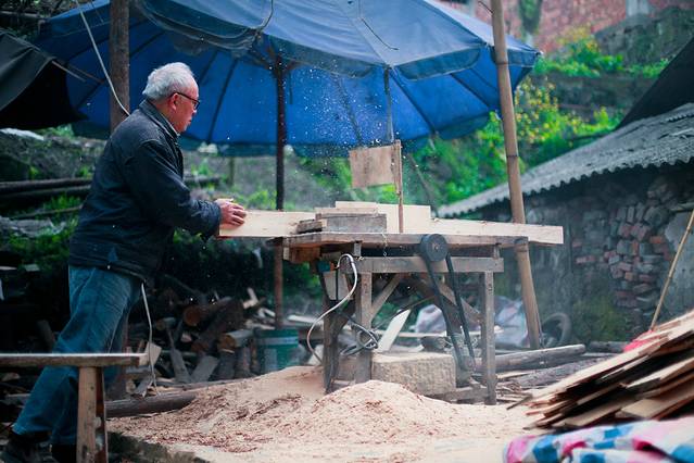 路边一老人在锯木头