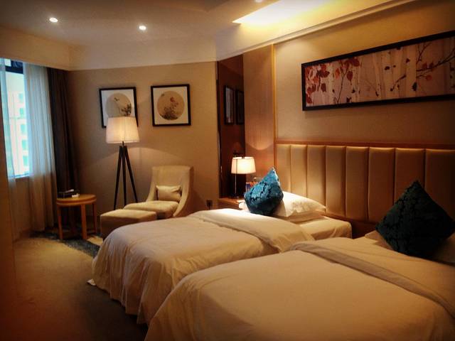 标准间,看着很舒服,房间的设施很齐全,打开衣柜,有保险柜,两件浴袍,擦鞋的鞋盒。柜子旁边就是小吧台,有三种杯子,适用于不同的需求,咖啡杯,玻璃杯和茶杯,也有雀巢的咖啡,当地的特产绿茶和茉莉花茶。还设有放裙子的架子。很方便。房间里的卫生纸配备也是很齐全,小桌上有,书桌上有,卫生间擦手的有,擦屁屁的也有哦。卫生间还配备了针线包,电子秤和脏衣篮,还有音乐公放,就是在卫生间都能调电视机的声音大小,有个音响在卫生间,简直不能太齐全了。所以住这里有什么不开心的么?肯定木有咯。