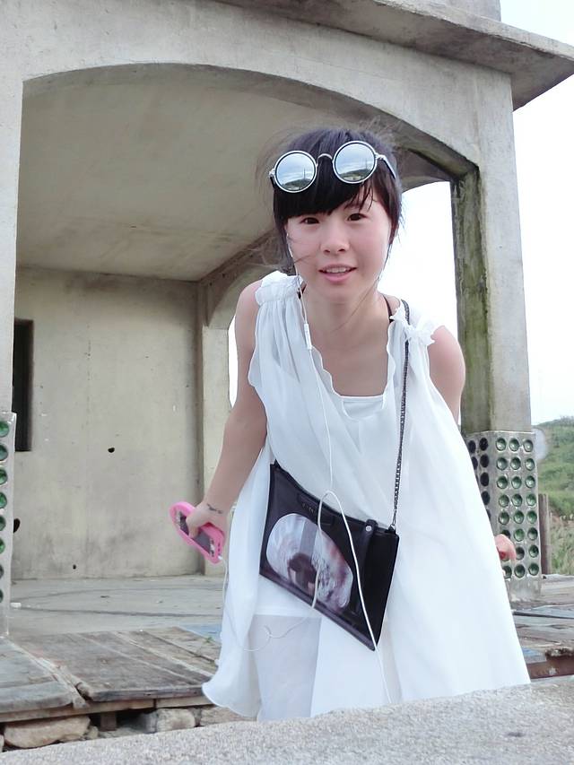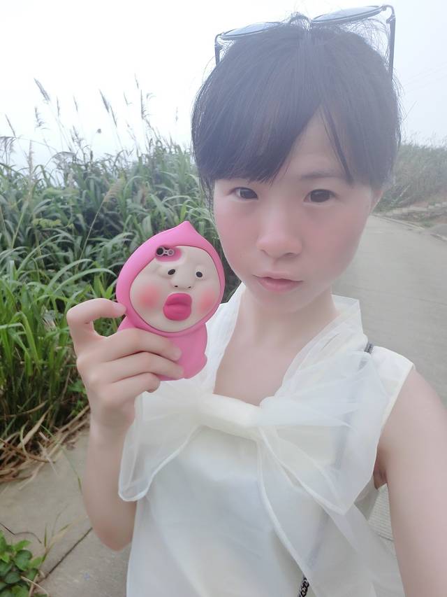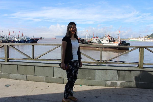 超级开心的妈妈~ 后面是黄黄的舟山的水
