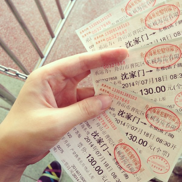 由于电影《后会无期》的上映,所以东极岛一下子去的人特别多。当晚11点到半升洞码头看的时候已经有一些阿婆在排队了😂,给了排在前面的阿婆50定金,让她帮我们排着队。第二天阿婆果然没有失信,早上4:30就打电话给老爸,让他去排着了,终于到6点多买到了中仓的票。还给了阿婆150元。