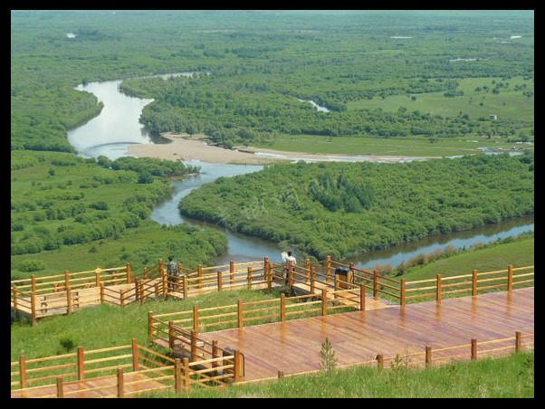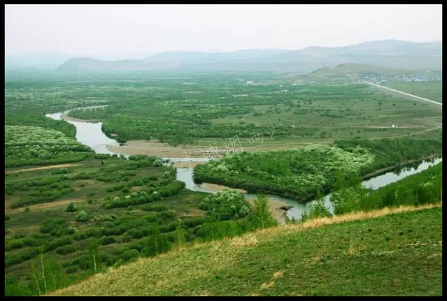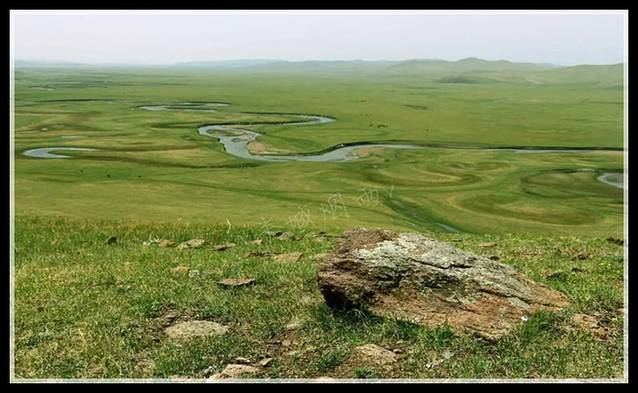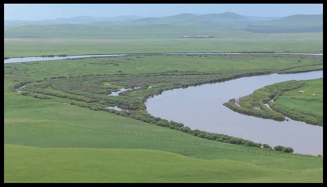 金帐汗以西十公里就是莫日格勒河景色景色最美的地方,莫日格勒河是一条河道十分狭窄,但却极度弯曲的河流.如果从空中俯瞰,蜿蜿蜒蜒的河水,就象是一条被劲风舞动着的蔚蓝色绸带,悠然飘落在碧绿如玉平坦无垠的大草原上,一会儿东行,一会儿西走,一会儿南奔,一会儿北进,其弯曲程度,用九曲十八弯来形容是远远不够的.。