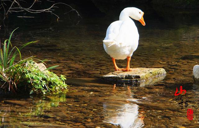 吊脚楼上吊着大蒜、包谷、红辣椒、蓑衣、斗笠。屋顶飘出袅袅炊烟,门前的溪水里,鸭鹅嬉戏。