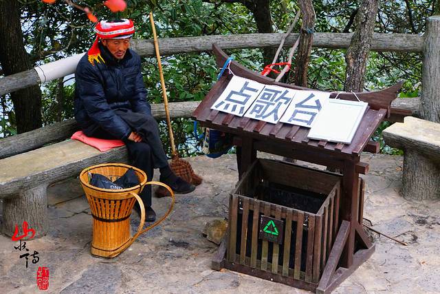 转角看到老爷爷的点歌台。老爷爷刚喊完歌正在休息 不敢相信如此洪亮的嗓音来自老爷爷,东瞅西瞧除了再没发现别的什么人,于是斗胆唱一句道:“老人今年高寿?”老人唱道:“老汉我今年八十一岁了!”好一个精神矍铄,声如洪钟的土家山歌王!