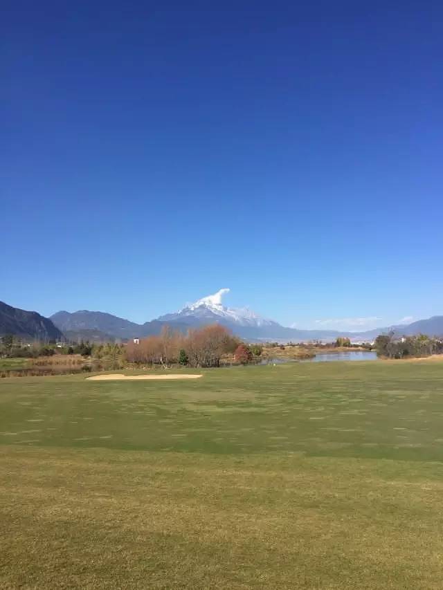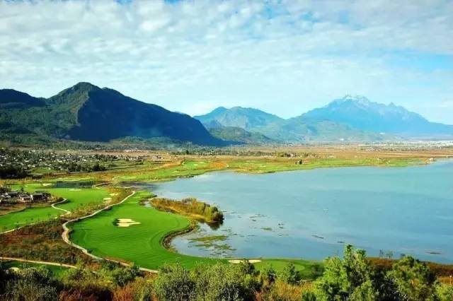 文笔山是一个看雪山绝佳的观景胜地,文笔海是丽江坝区最大的湖泊,从文笔山这头看去,湖泊仿佛在雪山下,高尔夫球场与柳林在湖泊中映衬,美丽至极。