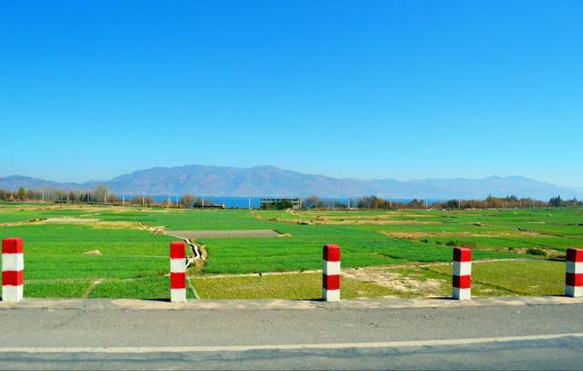 远远的隔着翠绿的田野还能看到蔚蓝的洱海
