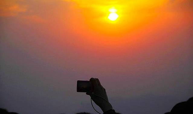 太阳还未探出头来,大伙都举着手机、相机等待日出一刻,记录下来。