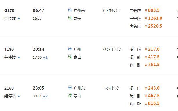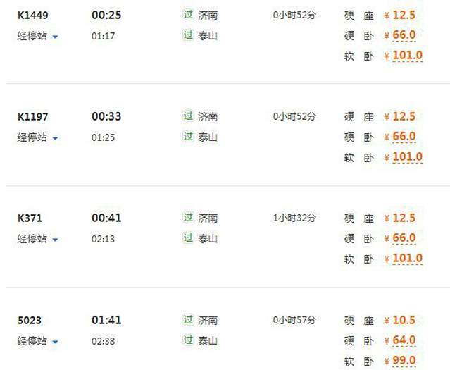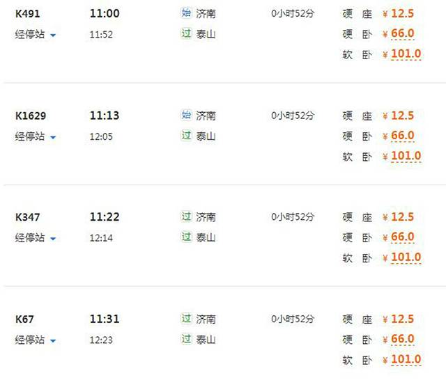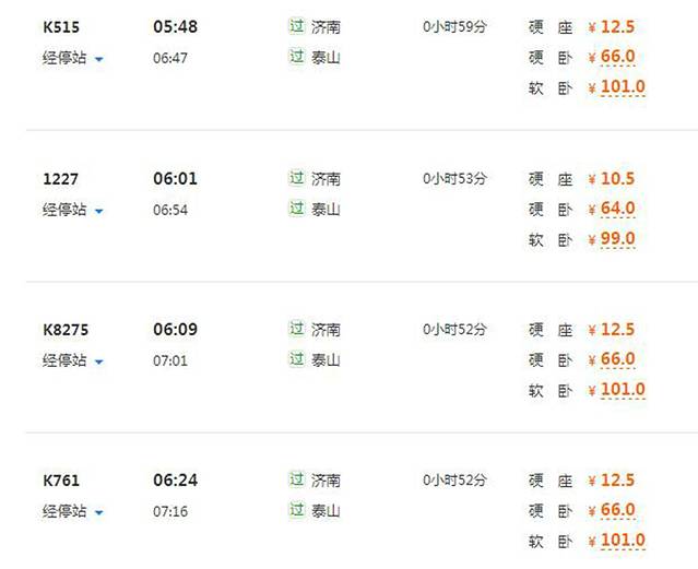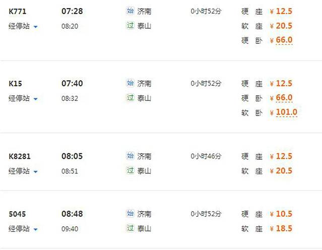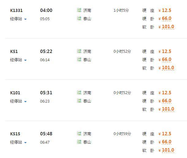 1.济南——泰山,每天有43趟班次左右,平均每10-20分钟有一趟是开往泰山火车站。其中泰山火车站是离泰山景区最近的一个站点,乘坐公交车大概4站左右即可到达。票价:硬座12.5元、硬卧66元、软卧101元,时间大约1个小时不等。