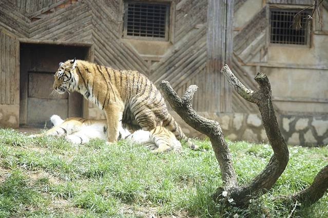 当然,动物园最令人惊心动魄的期待就是与森林之王老虎之间的亲密接触,这是每个动物园都有的场景,然而我之所以要提及一下正是这里的老虎与别处园子的老虎并不一样。当其他老虎在慵懒的睡觉,休息的且提不起精神的时候,这里的老虎竟然毫不遮羞的当着人类的面儿谈恋爱。