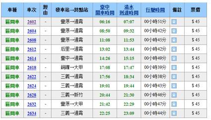 区间车:费率1.46元/公里,运行于各个城市之间的列车,每站都停,旅行速度大约在40km/h,相对比较慢;座椅以类似地铁的长条椅为主(运行于屏东-枋寮-知本-台东-池上-玉里-花莲的东线区间车为复兴号车厢,软座)。