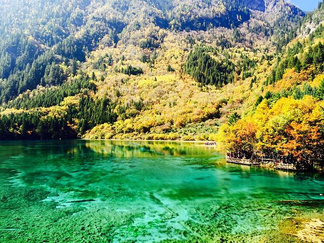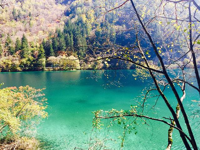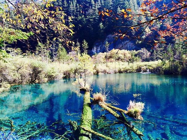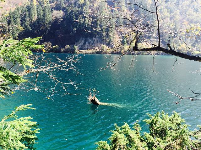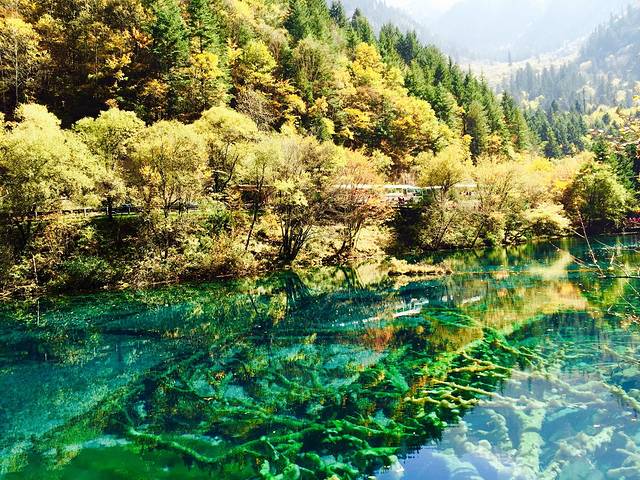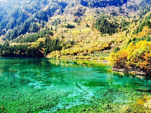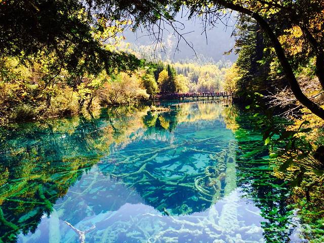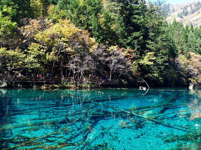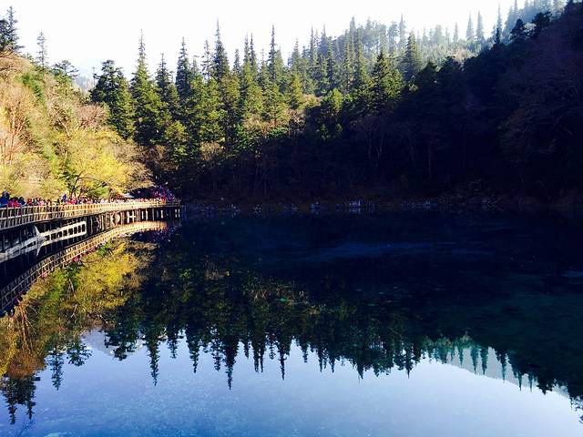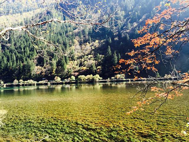 一点也不意外的,过了珍珠滩瀑布,我与老大又走散了,我一路狂奔追赶老大,还是找不到,后来终于到了镜海,但是镜海的乘车点只在刚到镜海的地方,要看镜海沿着人行栈道走的话,就只能一直走到诺日朗中心了。我不想放弃镜海,于是就一直沿着人行栈道走,镜海在上午时候最是惊艳,那时候在车上能看到海子中倒映出整座的秋山,蓝天。不过,各个时间有各个时间的美。