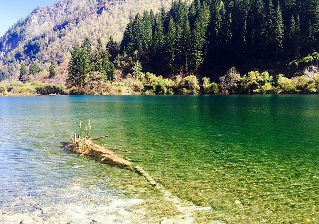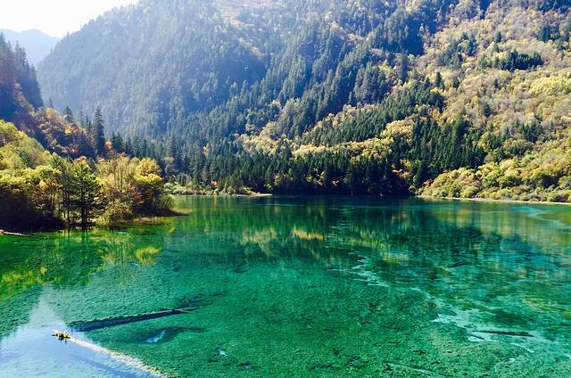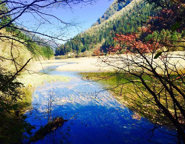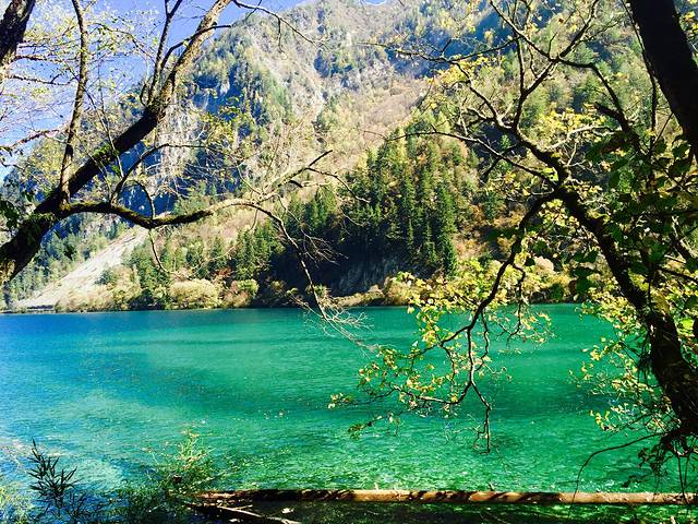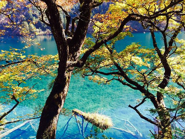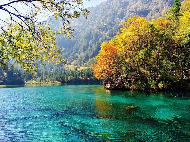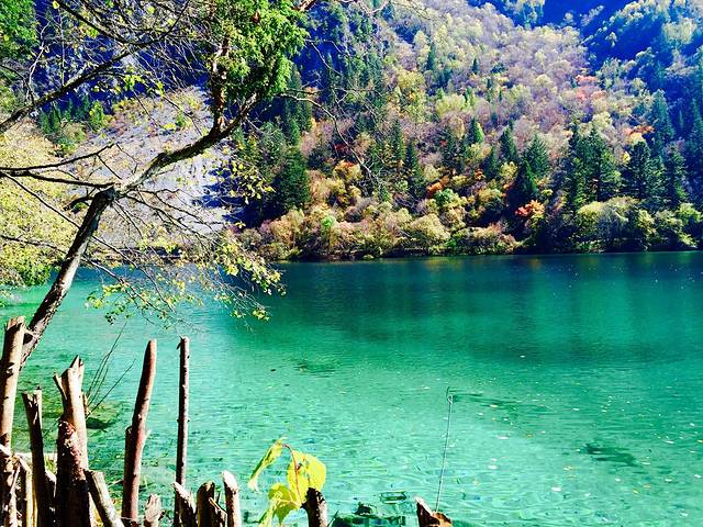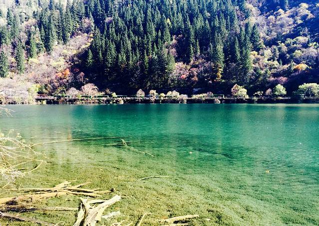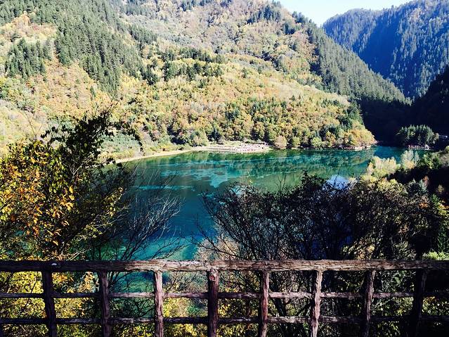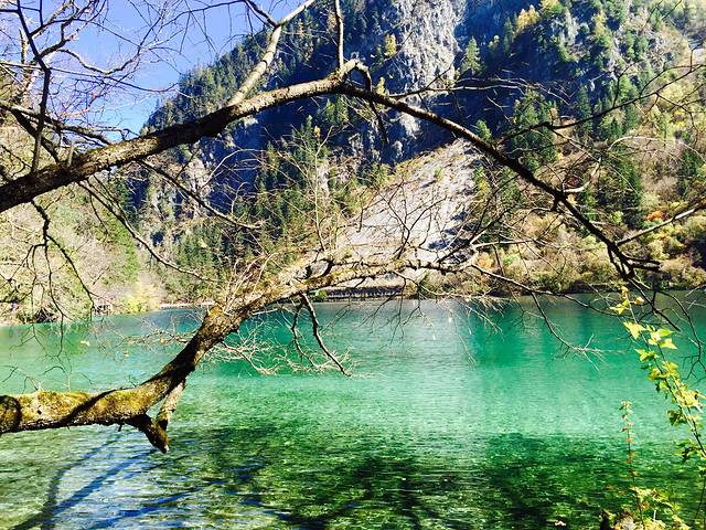 一点也不意外的,过了珍珠滩瀑布,我与老大又走散了,我一路狂奔追赶老大,还是找不到,后来终于到了镜海,但是镜海的乘车点只在刚到镜海的地方,要看镜海沿着人行栈道走的话,就只能一直走到诺日朗中心了。我不想放弃镜海,于是就一直沿着人行栈道走,镜海在上午时候最是惊艳,那时候在车上能看到海子中倒映出整座的秋山,蓝天。不过,各个时间有各个时间的美。