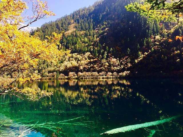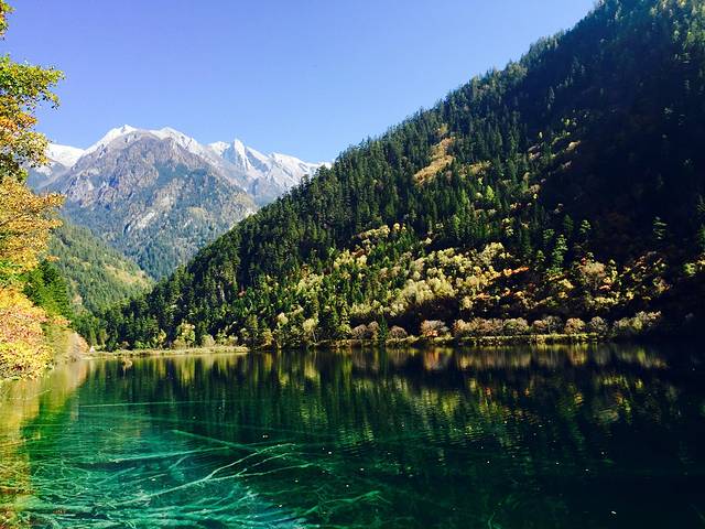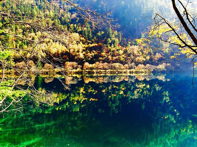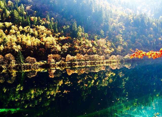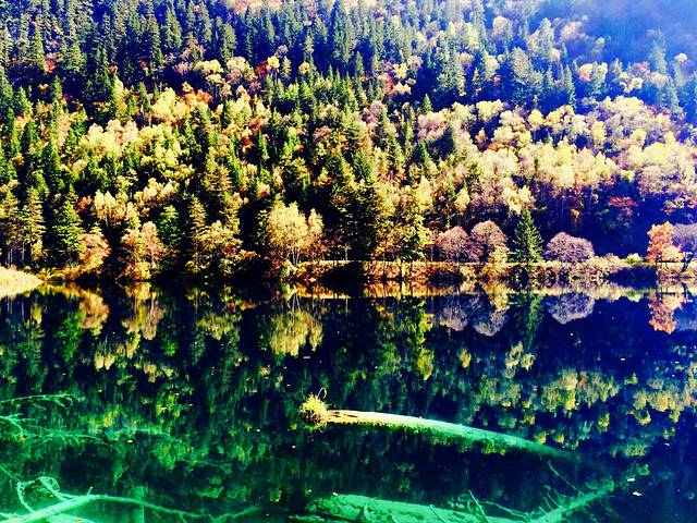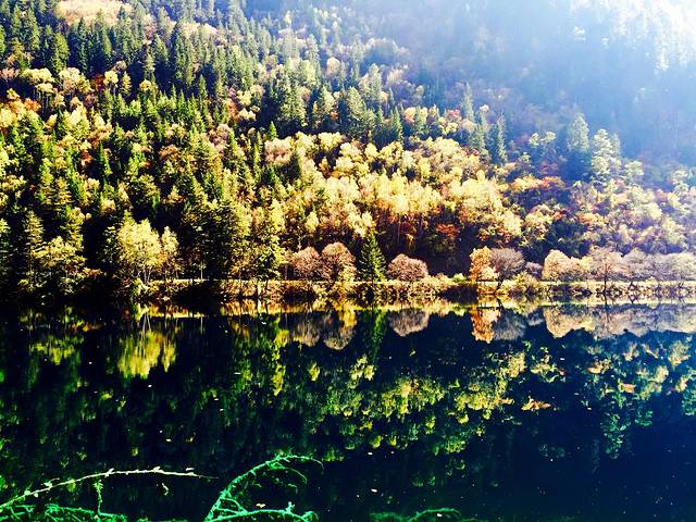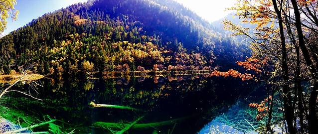 车过了诺日朗中心,刚到镜海,看到镜海倒影的那一刻,我们就被瞬间秒杀了,真的太美,湖面非常平静清澈,真的景如其名,就犹如一面掉落凡间的镜子,倒影着山,和天空,以及五彩斑斓的秋色。