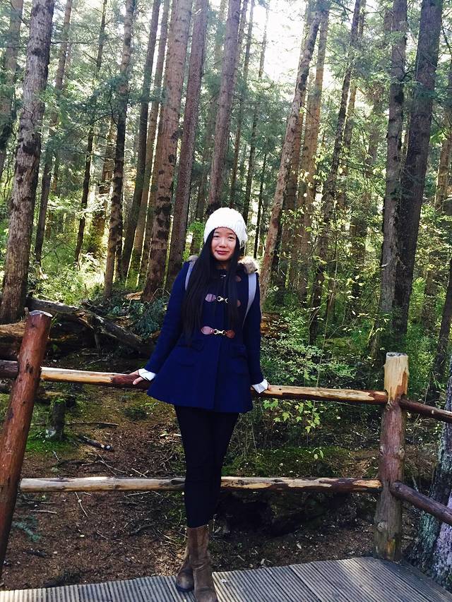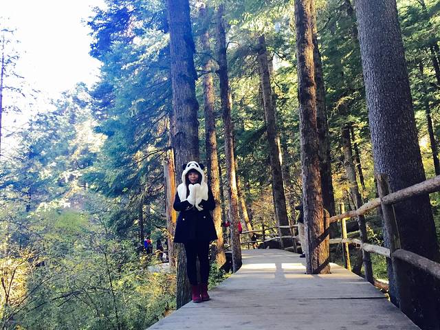 一路看着美景到了日则沟的最高点原始森林,远处是雪山,原始森林里面的栈道人不是很多,所以这里匆忙让老大拍下了唯一的一张单人照,也算是拍了一个到此一游。后面的景点几乎全程人海,我们根本就不想拍人,也放弃了拍人。所以说九寨沟的旺季虽然美到没天理,但是人也是挤到没天理。