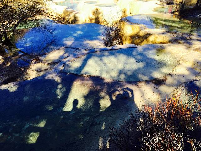 没人给拍合照,我与老大只能拍个影子的合照了,这是唯一一张我跟老大在黄龙的合照了。顺便说句,由于游览人数壮观,我们与小亚、小杰早就已经被冲散了。