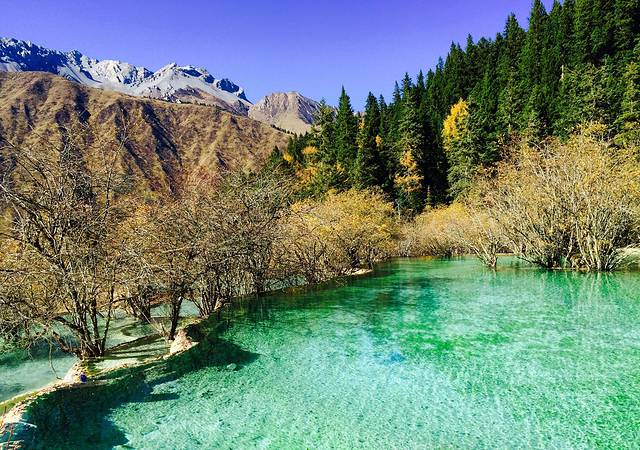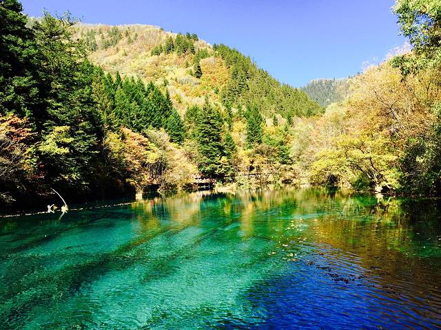 几近两个小时的路程,我跟老大终于到达了终点----五彩池,在看到五彩池的那一霎,觉得跑的如此辛苦也是值得的。虽然时间已经有点晚,没有阳光直接照耀在五彩池上,但是也是可以看到斑斓的色彩,能够看到远处的阳光与山岚、秋色十里倒映在池中。看过西藏辽阔的美,在这里,你会发现,别处悠悠的美,小巧别致,惹人回味。