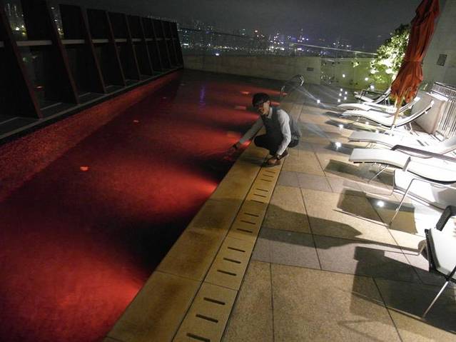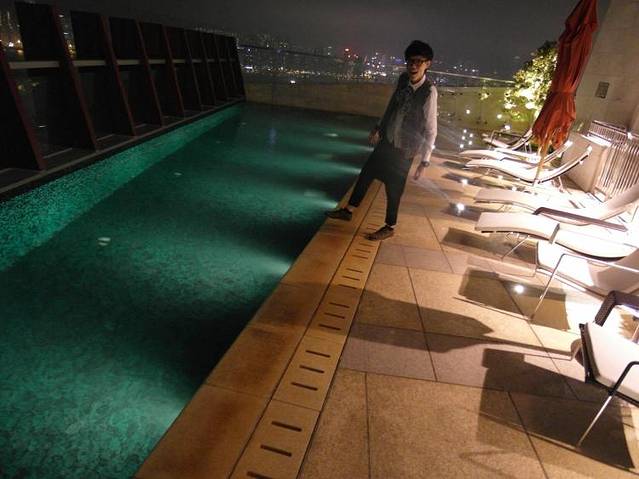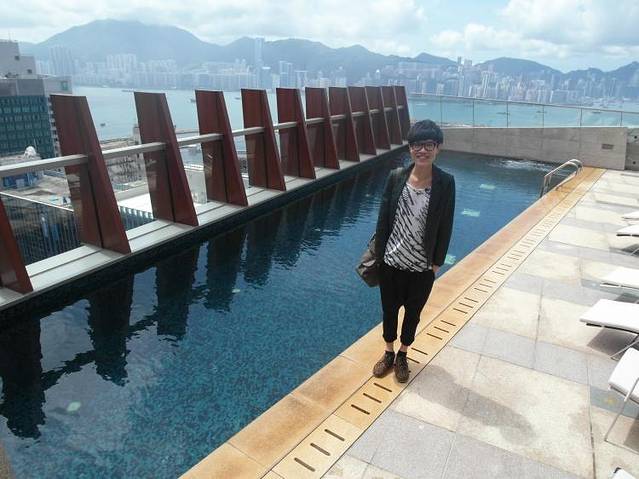 酒店的泳池非常漂亮,水的颜色随着灯光变化的,一边游泳还可以一边看到HK的迷人夜景。