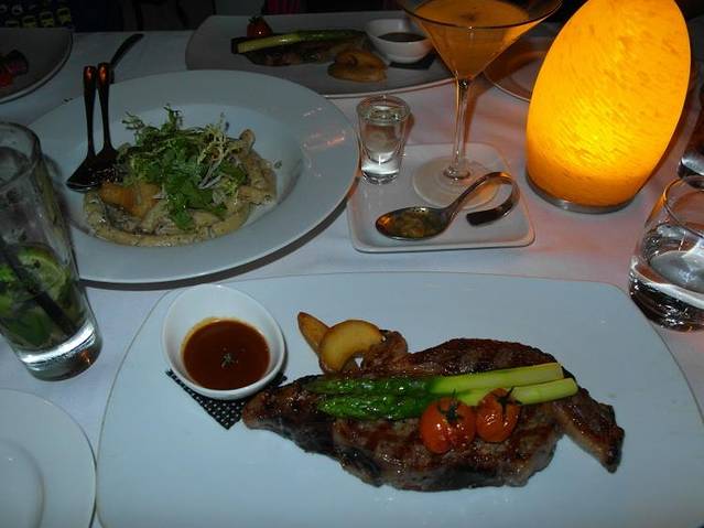 点了些饮品喝着,点主菜,我点了美国牛扒,无敌海景真的很美,8点还有幻彩泳香江观赏!
