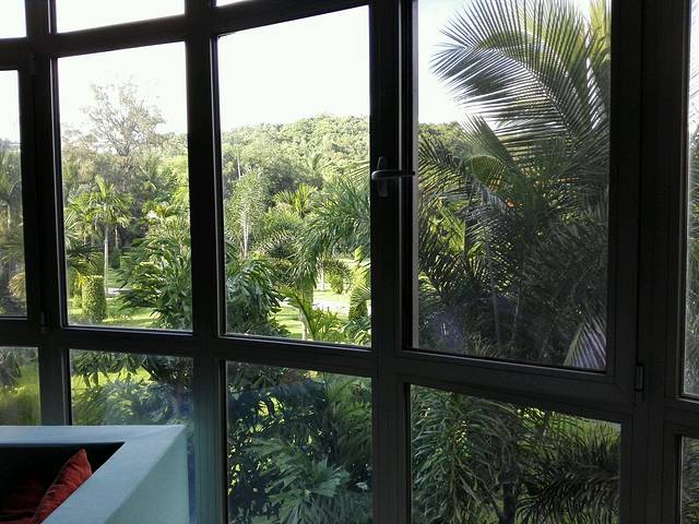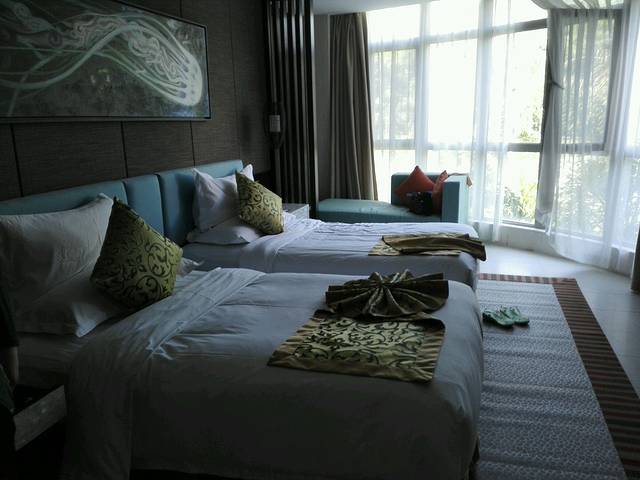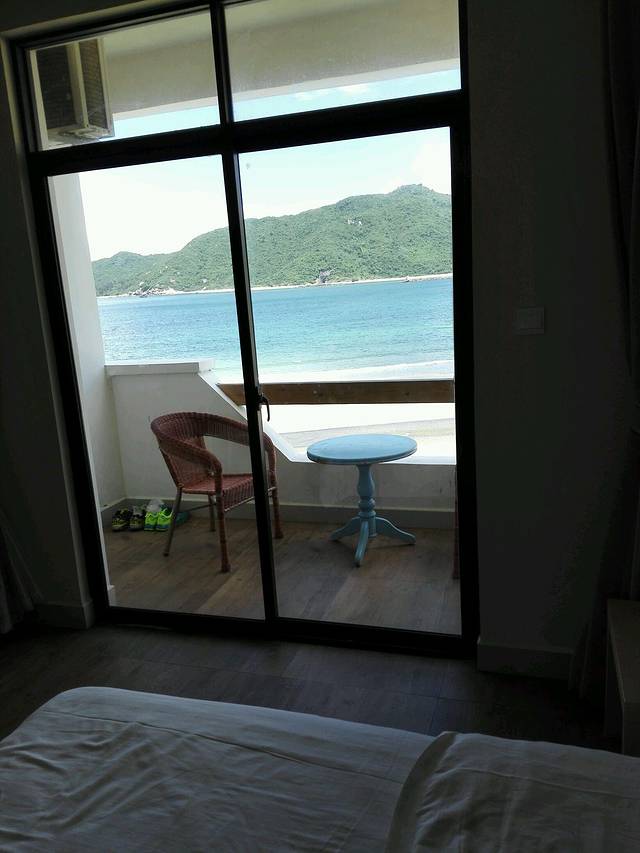 海景房 双人大床房条件好点,卫生间有玻璃门。双床房只有门帘隔开,然而并没有想象中的异味,为了更好的休息,还是双床房了。阳台正对着后海湾,极美!