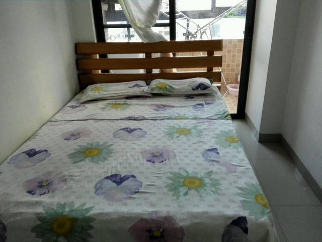 忘了拍照了。和网上的照片一样,客厅一个高低母子床主卧1.8米床(均有挂式空调),次卧1.5米床(无空调)。简装但是很干净,作为过渡很划算啊!每张床都可睡两人,住8个人是没问题的,客厅还有一个长沙发。