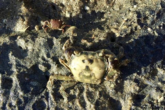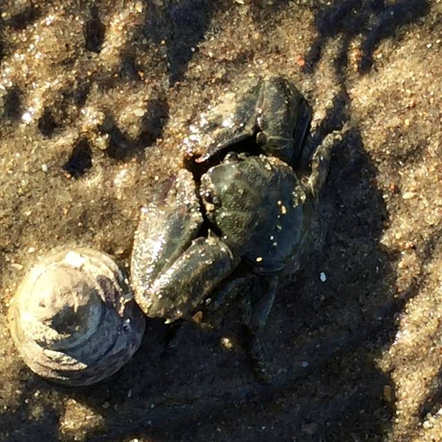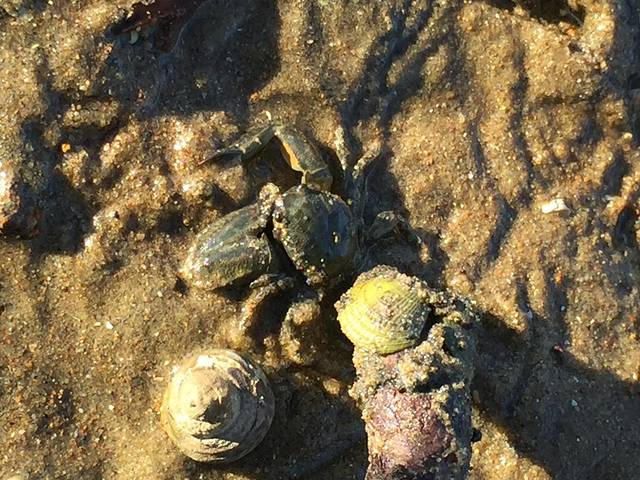 在去到Manukau heads之前,我们首先来到一片搁浅的海域,我习惯性的捡拾贝壳却无意中发现了一只比手指略大点的螃蟹。于是,接下来的一个小时里,我们慢慢沿着海水的方向找寻起藏在石头下的小螃蟹。