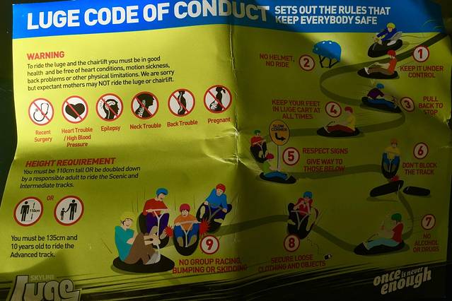 luge是这里知名的一个游玩项目,你戴好安全头盔后,坐在底盘极低的三轮车上,靠重力往下使劲冲刺,刺激到令你尖声惊叫!滑板车分为初级、中级道以及高级道,总长5公里(目前高级车道正在修葺尚未开放)自上而下的俯冲而来,到达终于后,再乘坐两人座的小缆车返回起点处。因为之前在Queenstown有过相同体验,知道一两次满足不了我们的玩心,于是买了最多的七次。于是,我们两个大孩子就在这滑板车里沉醉得无法自拔,直到中途肚子饿的咕咕叫才肯稍作罢休。如果你预感到自己也属于这种人类,在买票时记得买缆车+3程(或+5程或+7程)的联票,能省下不少玩乐的银子噢!