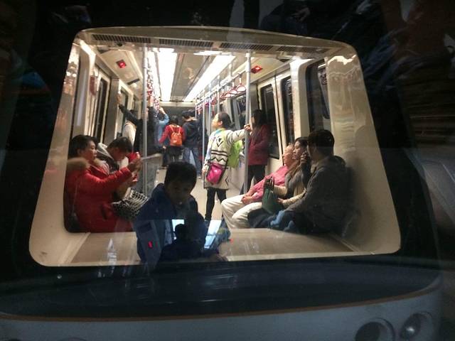 花城广场中轴线上有APM线,朋友在介绍时,还听成是BRT,大城市有的是机会接触现代科技的馈赠,APM也就是无人驾驶城铁吧,尝试着从海心沙乘坐一站到广州塔,前一节车厢的小朋友玩得正hi。