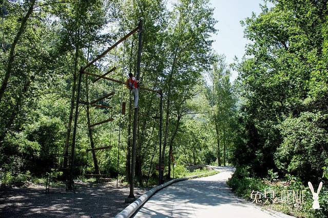 进山不远就是一处拓展训练基地,精力充沛的队友分分钟就爬上高杆。
