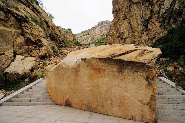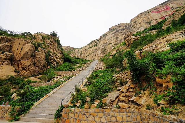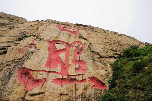 日照河山风景区离吴家台村也不远,正西方向十几公里,也是来日照不能错过的好地方。景区的大门在改造施工,但这里不能自驾车进入,车子放在山下的大门口,也不用交停车费,景区车来回15元,可以把你送到半山腰的地方,从这里爬到日照巨书的位置,也就是景区的最高处,然后从山背后的悬崖栈道下山,然后再坐景区车回到大门口。