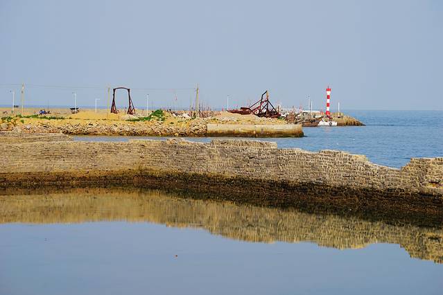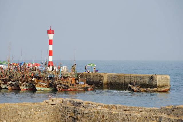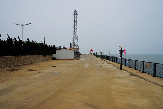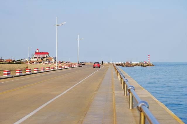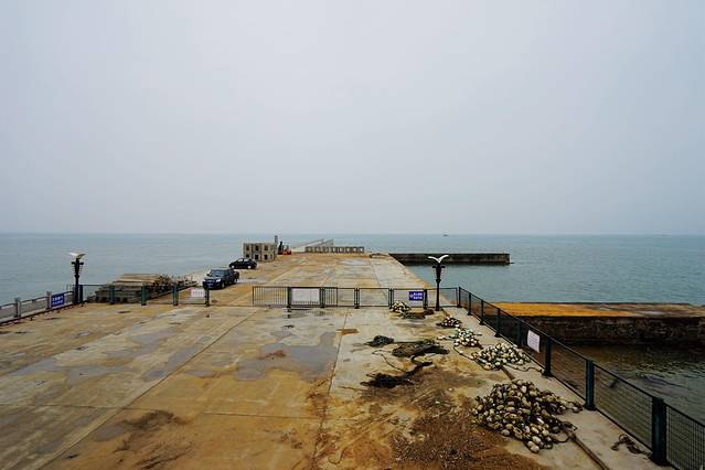 桃花岛对面就是桃花岛码头,长长的堤坝伸入海中,形成了一个可以停放船舶的避风港。