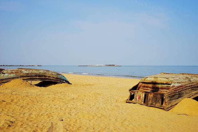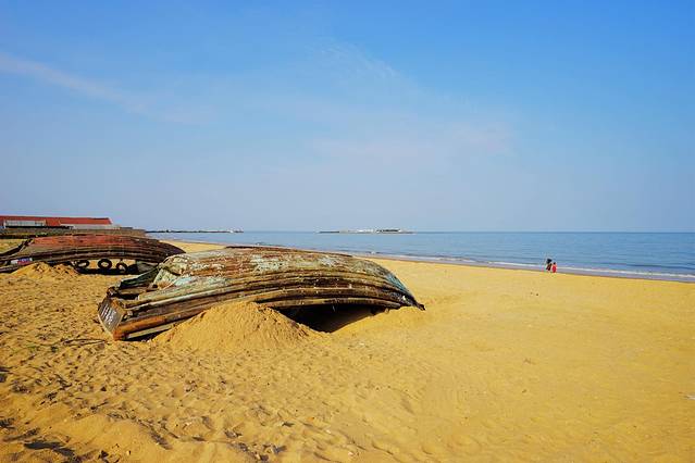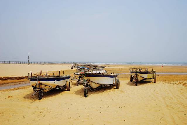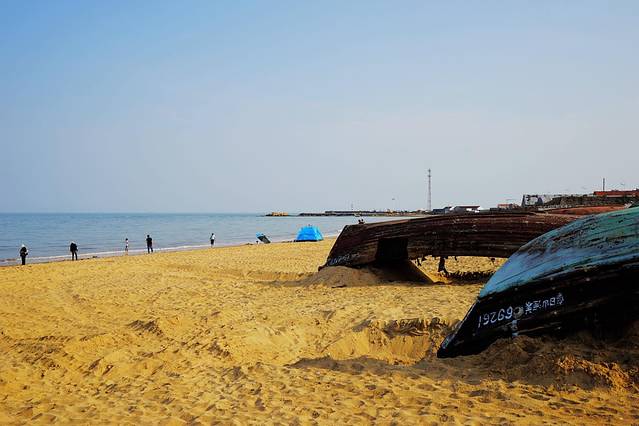 桃花岛的位置是在李家台和张家台之间,桃花岛旁的这处海滨沙滩就是在桃花岛渔港和张家台渔港之间,在这里,两边的渔港都清晰可见,这里的很多渔船上面还写着张家台港的字样。