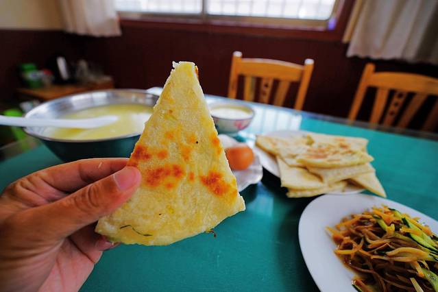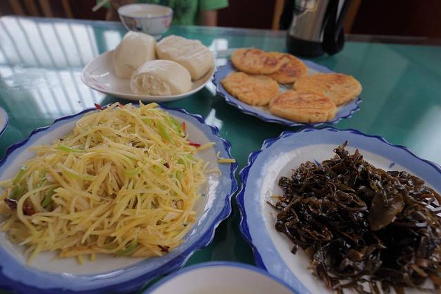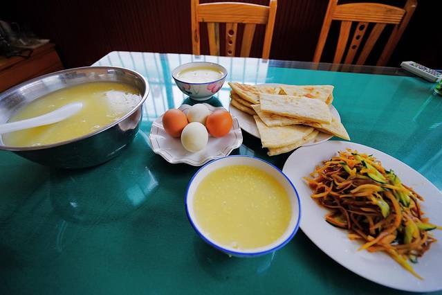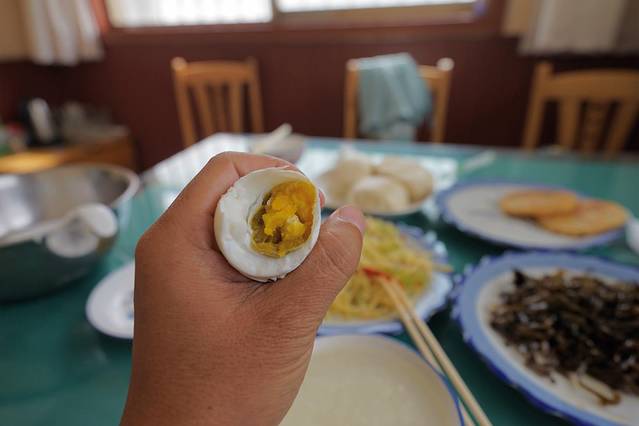 起得太早,有点困了,也有点饿了。回到北海渔家,迎接我们的是已经准备好的物美价廉的丰盛早餐。我发现日照这边的人特别爱吃鸭蛋,可能是用盐水腌制过,但并不是咸鸭蛋,只是略有一点咸味,很好吃,营养也比鸡蛋要高。