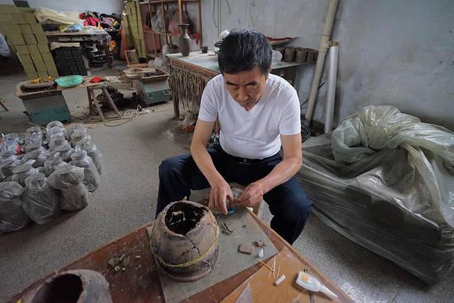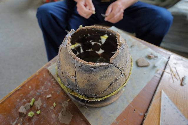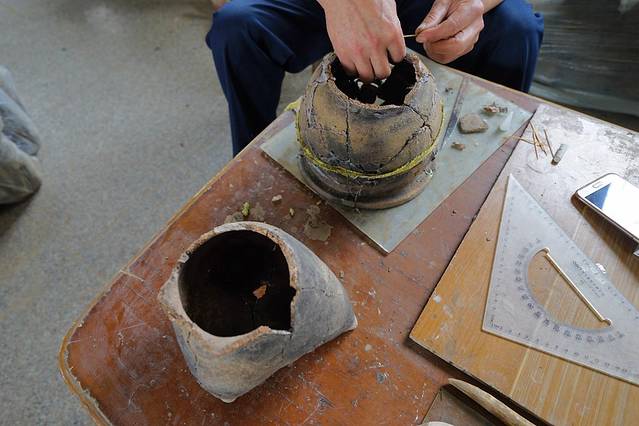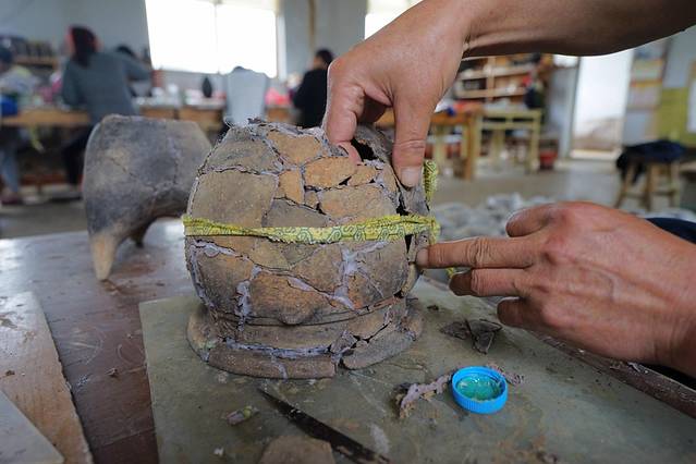 这是在修补出土的陶器,这种陶器没有什么文物价值,因为只是一些非常粗糙的生活器具,没有艺术性和观赏性,又破损的非常严重。