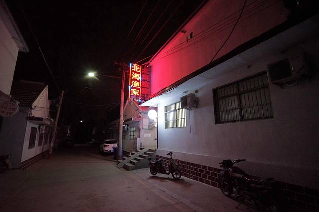 天色完全黑了,我们也终于结束今天漫长的旅程,抵达我们的目的地,日照吴家台的北海渔家。他家旁边的街道是吴家台南北向街道最宽的,所以停车非常方便。