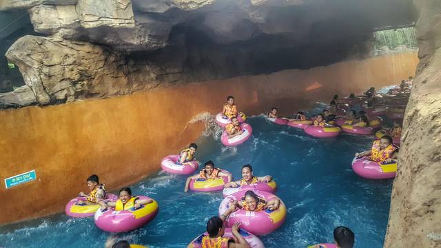 【巨洪峡】这个是比较舒服不会让人害怕的项目。无论会不会游泳,都必须穿上浮力衣,再套一个泳圈,这些在进去玩之前在门口就能拿到,不需要租。工作人员还会给你发一个小柜子给你放手机,是怕里面浪太大被冲走。All free.巨洪峡是像护城河一样,里面会有一个出水口,用于造浪,浪一波又一波的涌过来,浪推着人动,很舒服,不会让人感到害怕。如果人多,浪来了大家会碰到一起。波浪太强不碰会被撞到地上哈哈哈。适合玩累了去放松一下。