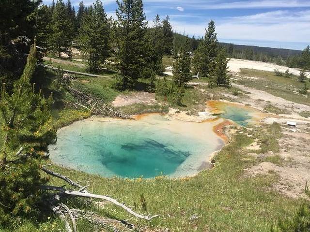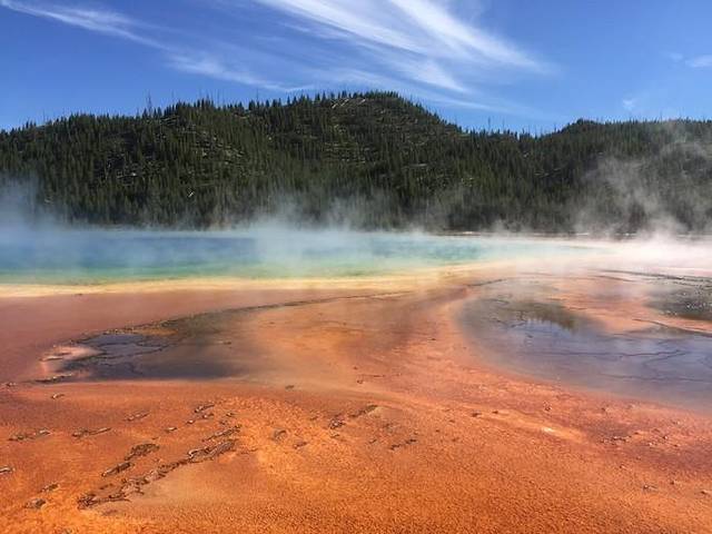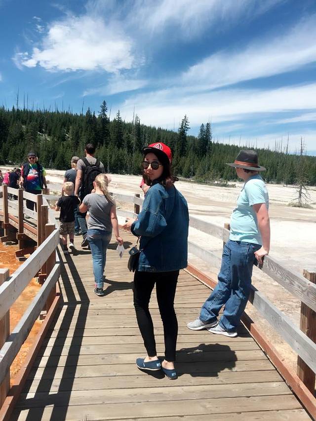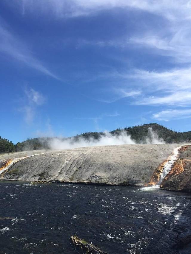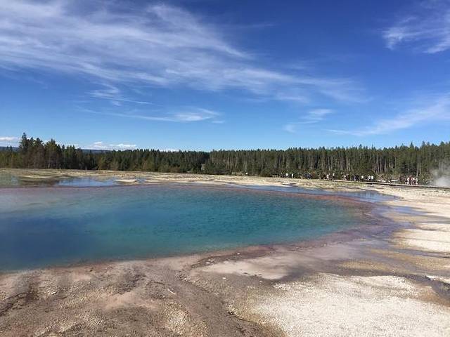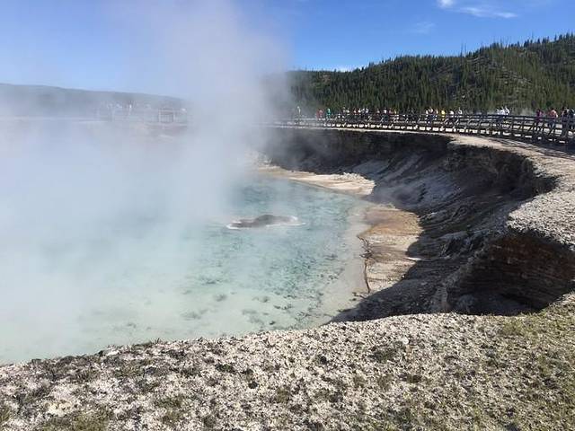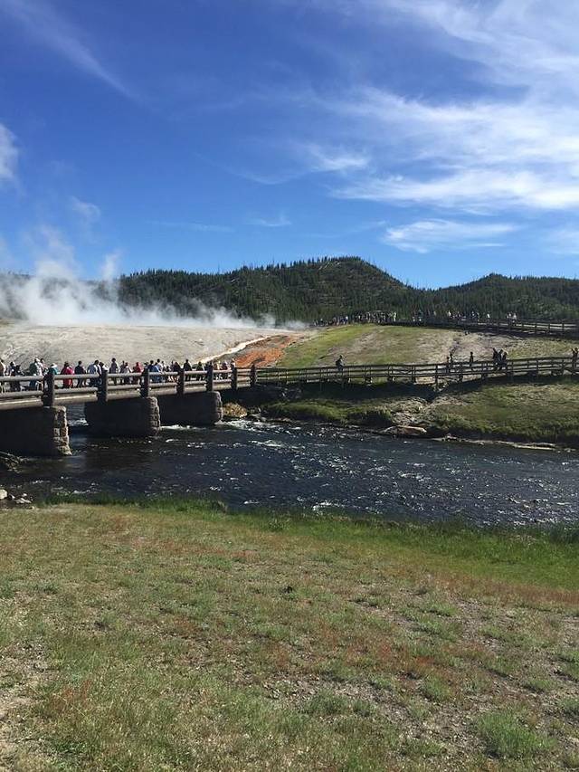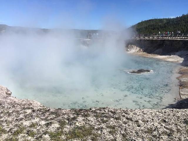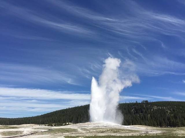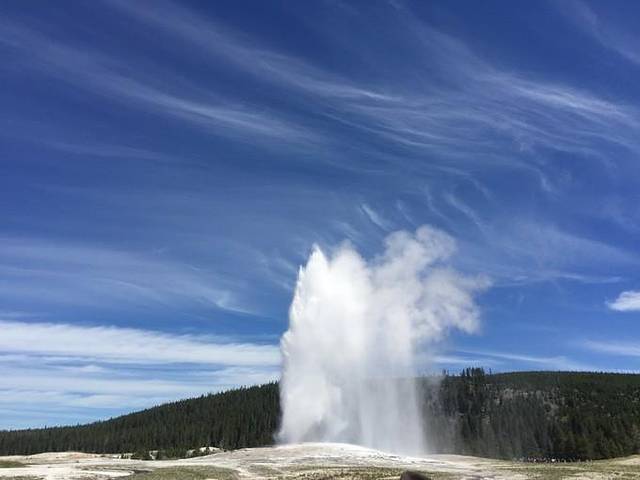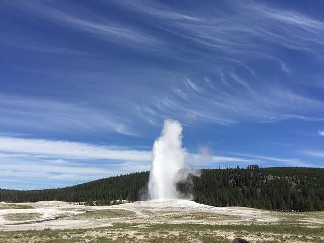 从酒店到黄石公园都要1个多小时的车程,下车就凑准时间关上了最有名的老忠实喷泉,据说之前它是每次准时喷发而著称此名的,不过它现在好像已经不那么忠实啦哈哈哈哈,目前是每隔90分钟喷发一次,上下有5-15分钟的误差
