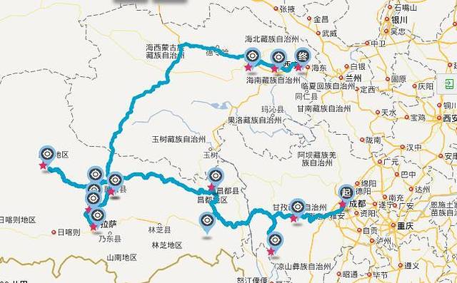 成都——新都桥——稻城亚丁——八宿然乌湖——昌都——那曲——拉萨——格尔木——西宁