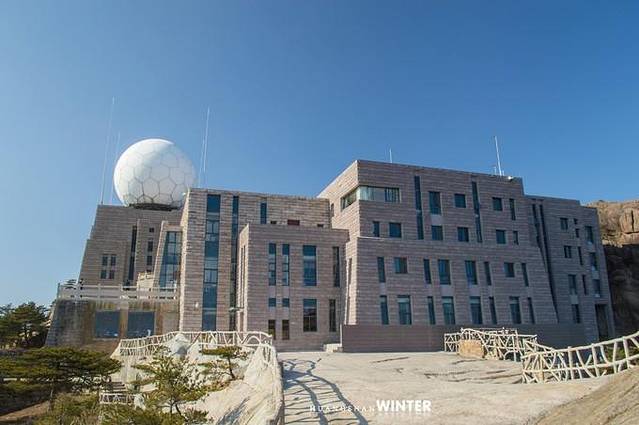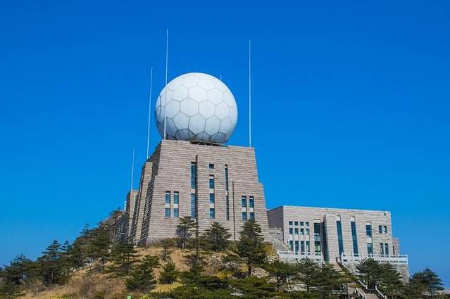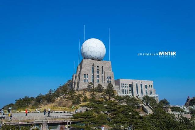 山顶建筑的巨大圆球是黄山的气象站台。