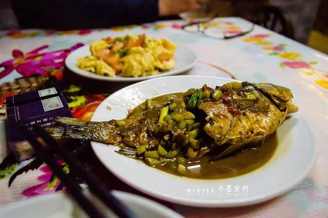 晚饭在客栈解决,红烧鲤鱼(8两)38元、西红柿炒鸡蛋18元、米酒3元一小酌。