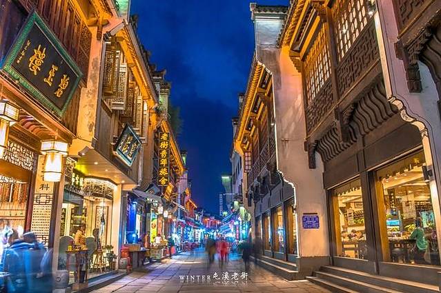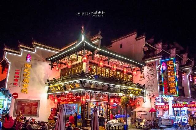 把握住黄金时间拍下这几张照片,老街在慢门之下变得金碧辉煌,天空尚有余蓝,游客行走中拉出的影子动感十足。我觉得到了夜晚老街的魅力才尽情展现在你得眼下。