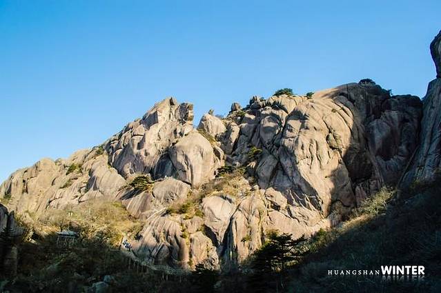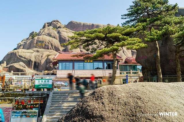 玉屏楼。可以在此乘坐索道下山,也可以步行下山,迎客松在玉屏楼左侧青狮石旁,是黄山的象征物,树龄八百余年,中午大逆光的环境下拍出的照片不是很理想,就不上图了;玉屏楼的左侧还有送客松和陪客松,也比较适合合影。时间还很富裕,问了旁边的保安得知步行下山只要一个小时,放弃了索道,不过后来没想到的是我足足走了两个多小时,坑爹啊。