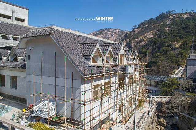 正在扩建中的西海饭店,外部工程已经完型,黄山上的改建需递交联合国申请,这是世界文化遗产的原因,山上的建筑大多人工费高昂,耗资成本加大。