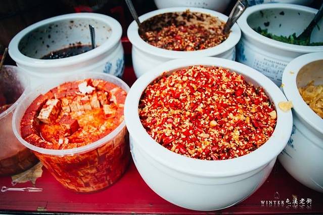 老街上比较繁多的卖点:酱菜。售卖的店铺很多,也都可以试吃。